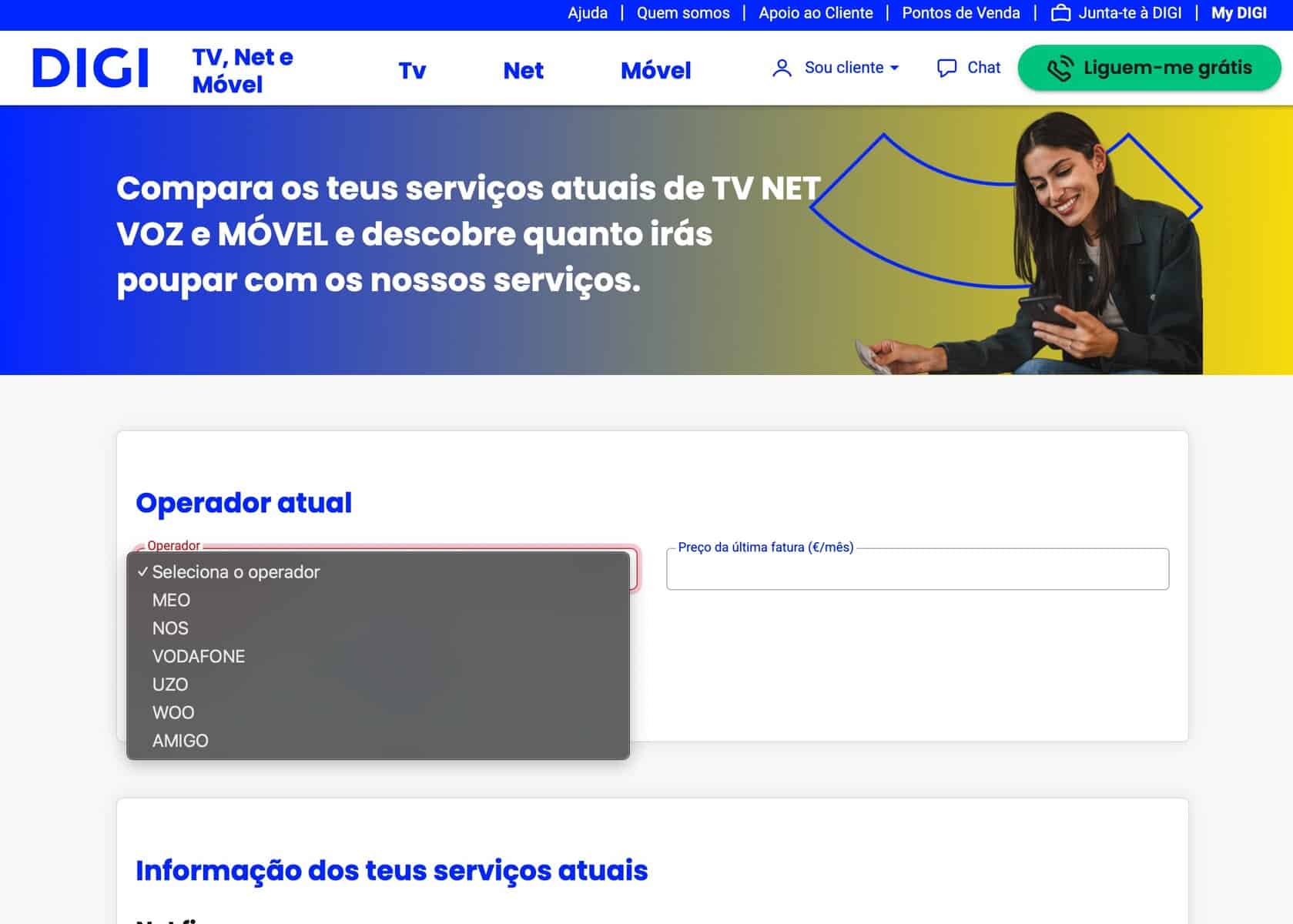 - Escolhes o teu operador atual aqui.