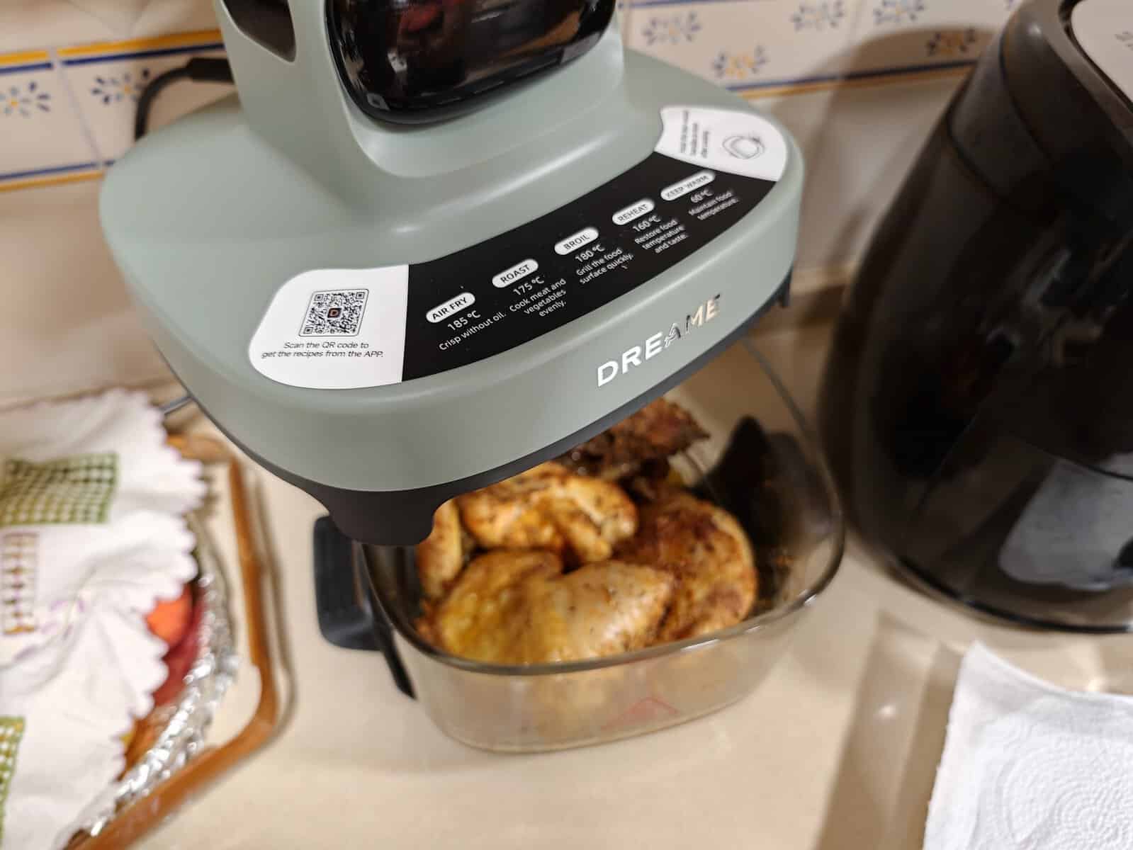 As batatas saem crocantes e o frango suculento, e tudo isto com um funcionamento surpreendentemente silencioso. Além disso, o design em verde suave e o sistema “plug and play” tornam-na muito apelativa. Portanto, tens aqui um gadget que não vai acabar esquecido num armário. A coisa funciona, e funciona bem.
