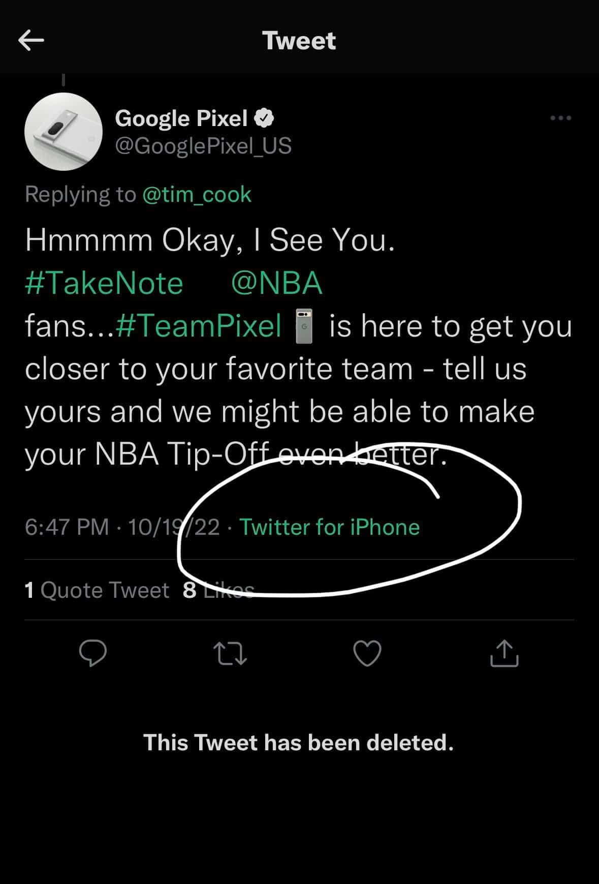 Portanto, mandar ‘bocas’ no Twitter não é de todo uma novidade, com as várias equipas de marketing sempre prontas a meter algumas imagens, ou textos, com alguma criatividade à mistura. O problema, é que neste caso, a equipa Google Pixel utilizou um iPhone para a publicação… Ou seja, nem a equipa da própria Google, usa um smartphone Pixel, preferindo o iPhone.