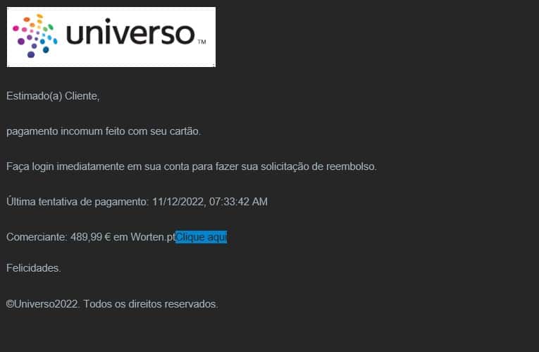 A Internet está cheia de esquemas, uns mais bem feitos do que os outros. Dito isto, enquanto em alguns casos percebemos logo que muitos e-mails e outros contatos não passam de uma trafulhice, noutros temos mais dificuldade em perceber que são falsos e que nos podem gastar muito dinheiro. Dito isto, o esquema que envolve a imagem do cartão universo está novamente a circular e a fazer vítimas. Assim tenha muito cuidado.