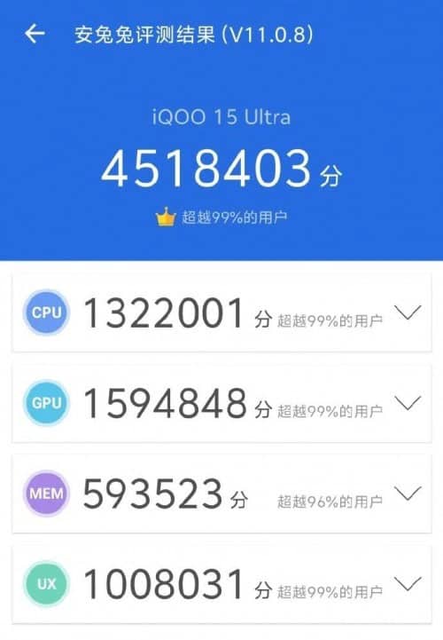 Segundo as listagens/notícias que circulam hoje, o iQOO 15 Ultra atingiu 4.518.403 pontos, com valores muito altos em CPU e, sobretudo, em GPU (onde o gaming vive).