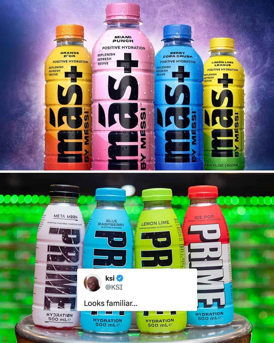 Portanto, caso não saiba da história, Messi também tem uma bebida, de seu nome Más+, que como pode ver pela imagem em cima, é uma cópia quase 1:1 da garrafa original de Prime.