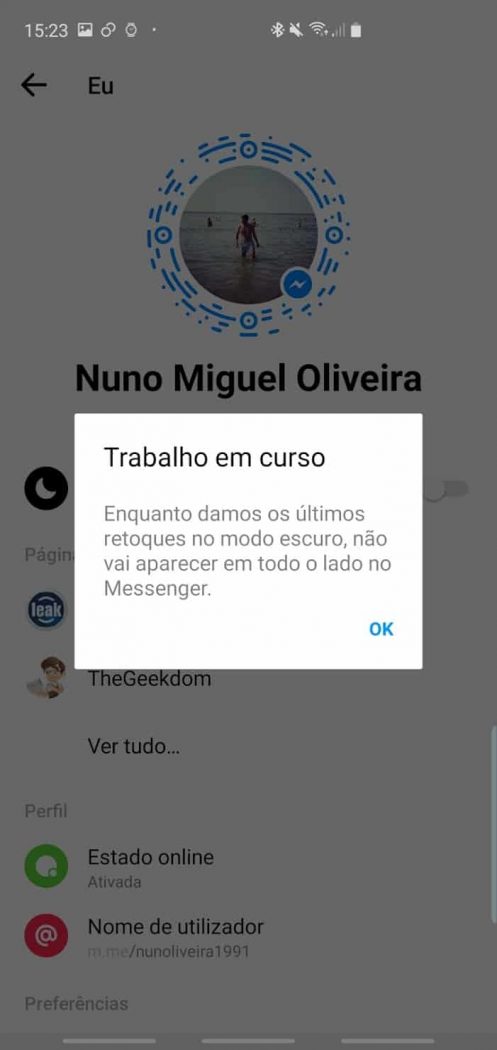 Depois basta ir às definições da aplicação e ligar o Modo Escuro! Onde irá encontrar esta mensagem, afinal, a funcionalidade ainda não está a 100%.