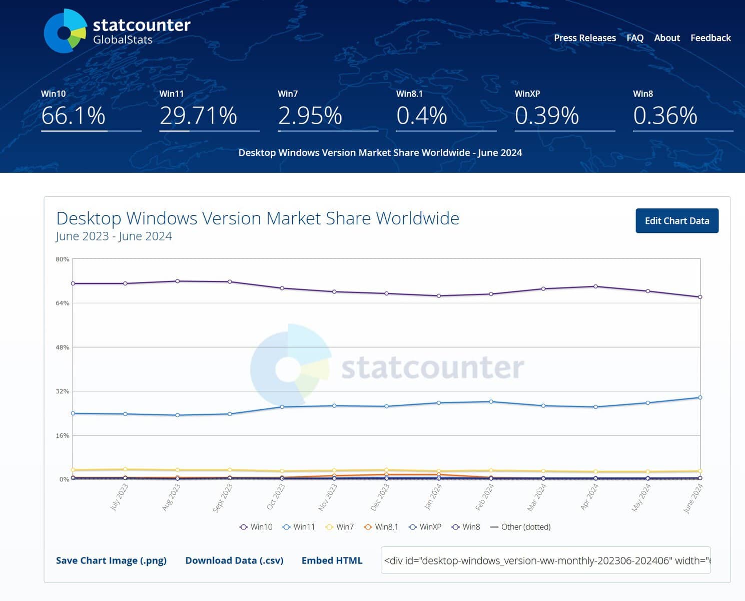Em abril de 2024, o Windows 10 tinha uma participação de 69,89% do mercado. Isto com o Windows 11 a registar apenas 26,19%. Tudo agora mudou com as estatísticas de junho a mostrarem que os utilizadores do Windows 10 caíram para 66 por cento com o Windows 11 até 29,75 por cento. Este é o valor mais alto desde o seu lançamento em 2021.