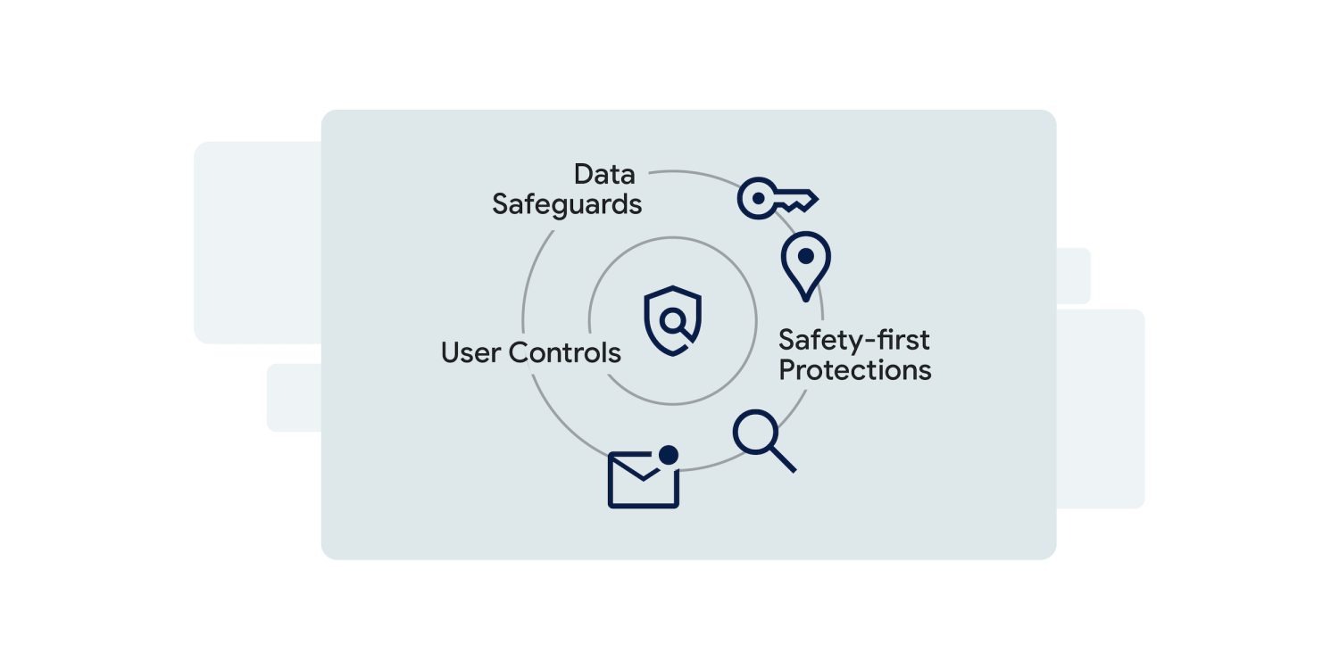 O sistema de Proteções de segurança em primeiro lugar inclui uma “proteção de segurança inédita que torna mais difícil o rastreamento indesejado para um local privado, como sua casa”. A rede FMD exige que “vários dispositivos Android próximos detectem uma tag antes de comunicarem a sua localização ao proprietário da mesma”. Esta “agregação por defeito” complementa-se pela descoberta do Nest, que utiliza os altifalantes e ecrãs para encontrar coisas quando se está em casa.