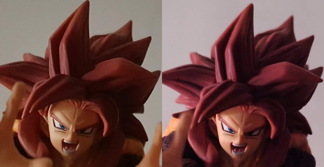 O mesmo acontece com a figura do Gogeta de DB GT, em condições de iluminação menos favoráveis. O Xiaomi, à primeira vista, até parece ter capturado uma boa imagem. Mas quando começamos a olhar para os detalhes, como o cabelo, e os olhos, é fácil de perceber que existe mais detalhe no lado do Note 8.