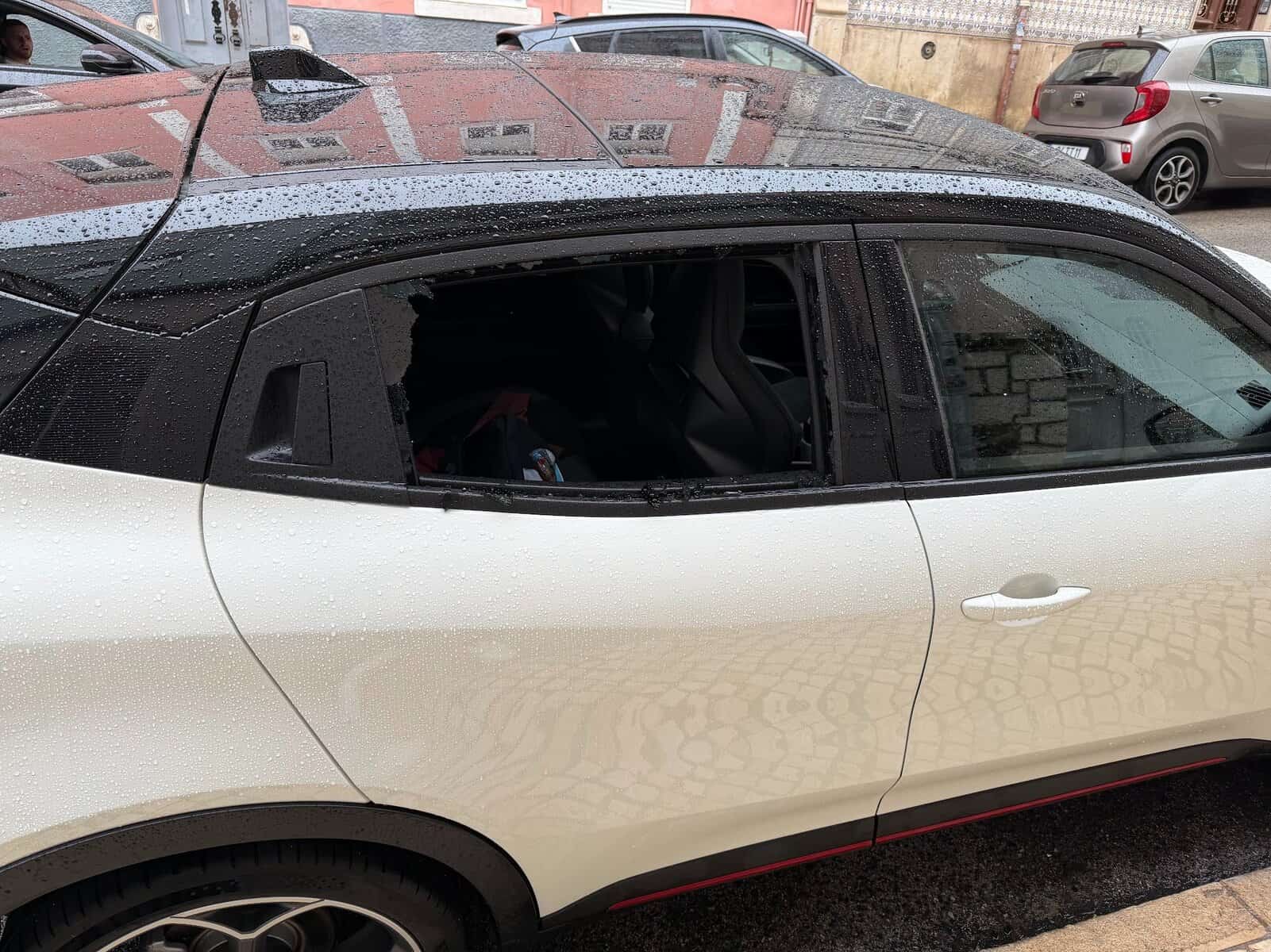 Estacionei o mais perto possível do restaurante, e fui almoçar. Devo ter ficado cerca de 30 minutos no restaurante, se tanto, porque já cheguei bastante atrasado, e como tal, nem comi… Inalei a comida para não deixar ninguém à minha espera. Quando voltei, o vidro do lado do passageiro atrás do pendura estava estilhaçado. Apesar do facto de não estar à vista, conseguiram descobrir e levar a mala de trabalho onde tinha um portátil, um smartphone de teste que ainda nem sequer foi lançado cá em Portugal, bem como o meu passaporte.