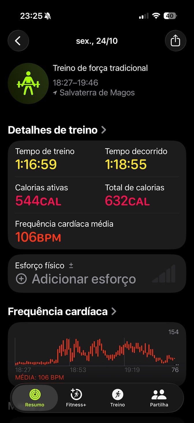 Ou seja, mesmo sem o Apple Watch, o meu treino ficou registado na app Fitness, e faz agora parte do meu leque de dados para app Saúde, completo com ritmo cardíaco, duração e até calorias estimadas.