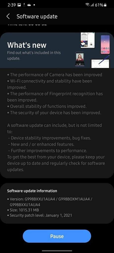 Vamos olhar para o que trazem os novos updates. Assim, a primeira atualização para a gama Galaxy S21 chega com melhorias no desempenho da câmara e conectividade Wi-Fi. O sensor de impressões digitais também foi otimizado. Ao mesmo tempo garante melhor estabilidade geral. A atualização também inclui os patches de segurança Android para janeiro de 2021. A atualização tem cerca de 1GB de tamanho. Entretanto o leakster @SamsungRydah revelou que os Galaxy Buds Pro também receberam uma atualização que melhora a capacidade de som, o sistema de despertar por voz Bixby e melhorias na estabilidade.