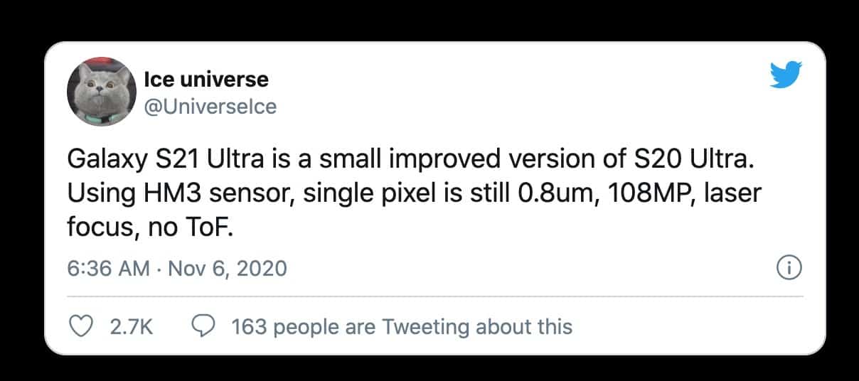A mais recente informação chega do conhecido leakster Ice Universe. Ele diz que o Galaxy S21 tem uma câmara atualizada de 108 megapíxeis, mas deixa de parte o sensor ToF. O tweet fala de um sensor HM3 e da tal focagem automática a laser.