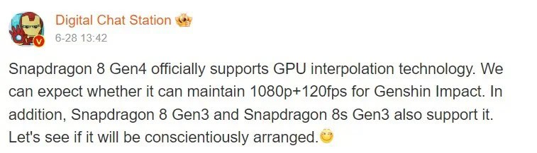 O leakster diz que o Snapdragon 8 Gen 4 pode executar o Genshin Impact com uma resolução de 1080p e uma taxa de frames de 120 fps (fotogramas por segundo). Se for verdade, estamos perante uma enorme melhoria na taxa de frames. Entretanto o Snapdragon 8 Gen 3 do Galaxy S24 atinge os 60 fps nas definições gráficas máximas do Genshin Impact. Isto é muito importante num chip de smartphone. A interpolação de frames é uma tecnologia relativamente nova, limitada às mais recentes gráficas para PC da AMD e da Nvidia. As suas soluções são denominadas FSR e DLSS, respetivamente.