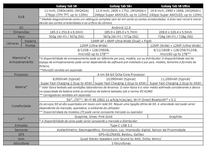 Uma excelente notícia, numa altura em que nunca dependemos tanto de tablets para videochamadas, trabalho e ou streaming de conteúdo multimédia. Por isso mesmo, cada Galaxy Tab S8 oferece uma experiência de videoconferência melhorada com câmaras frontais ultra-wide, uma configuração de três microfones, e tecnologia inteligente de Auto-Framing para uma experiência de videochamada verdadeiramente profissional. Antes de mais nada, vamos olhar para as especificações técnicas destes aparelhos.