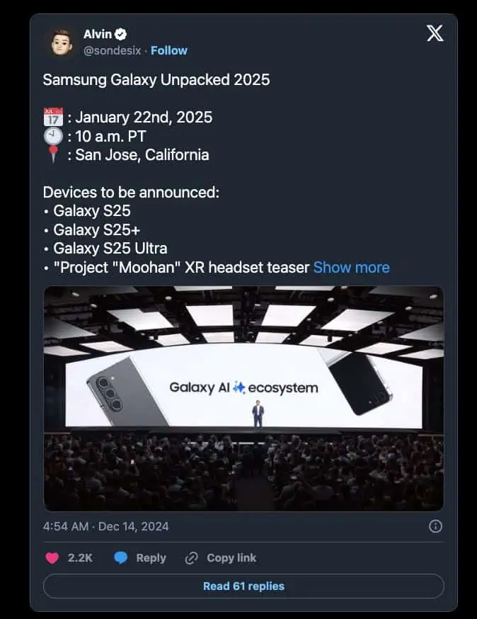 De acordo com o informador Alvin no X, a Samsung vai anunciar o trio Galaxy S25 no seu primeiro lançamento Galaxy Unpacked do ano, a 22 de janeiro de 2025. A fuga de informação também revela que o evento terá início em San Jose, Califórnia.
