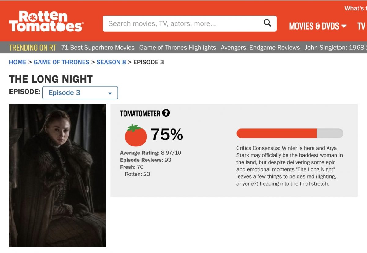 Assim, apesar da sua escala ambiciosa, e momentos cheios de acção, o terceiro episódio da última temporada de Game of Thrones. Com o título ‘The Long Night’, conseguiu uma pontuação de 75% no site Rotten Tomatoes.