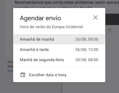 Assim o email fica preparado e é enviado na altura que escolhemos. Temos três opções predefinidas mas se darmos um clique em Escolher data e hora podemos definir todos os aspetos.