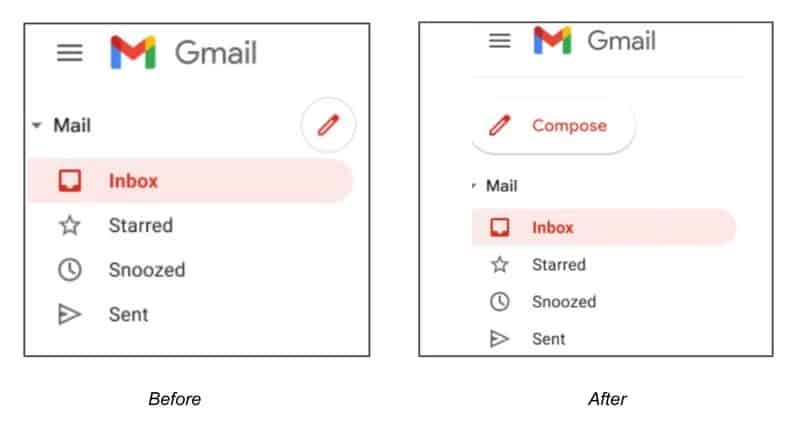 Mas as mudanças não dizem respeito apenas à dimensão do botão. Dito isto, vão ocorrer algumas alterações no design. O botão mais de quatro cores que representa o material design da Google, vai deixar de estar disponível. Em vez disso teremos um botão de grandes dimensões com um lápis vermelho e a palavra Compor dentro dele.