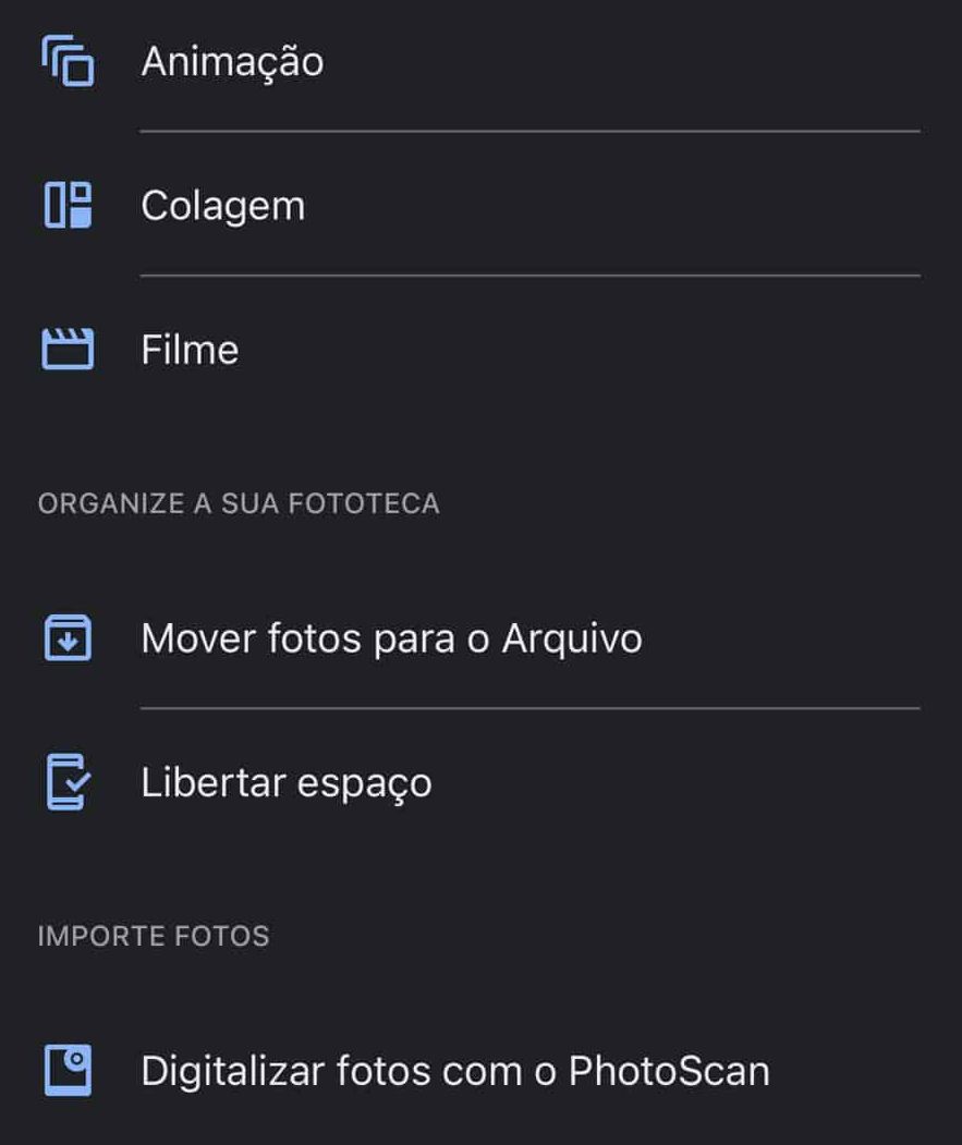 Deslize até ao final e lá vai encontrar a opção Digitalizar fotos com o PhotoScan. Se estiver num iPhone a opção Gestão chama-se Utilitários.
