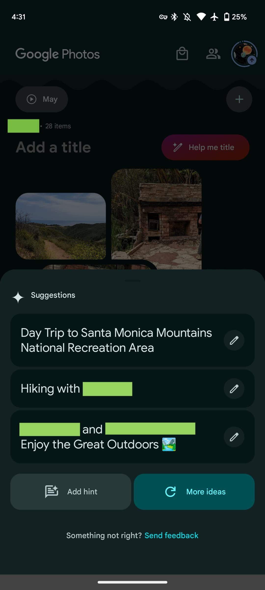 Os utilizadores podem criar memórias, que são pseudo álbuns do ponto de vista da edição e da partilha, a partir de um pequeno FAB (botão de ação flutuante) que só aparece quando se desloca para baixo. Entretanto, a IA generativa utiliza-se para oferecer “sugestões de títulos personalizados”. “Ajude-me a dar um título” abre uma folha que permite adicionar uma “dica” para orientar a geração.