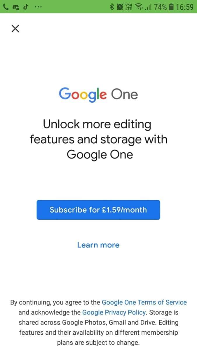 Em primeiro lugar, as linhas incluem avisos para os utilizadores sobre as funcionalidades premium. Nelas pode ver-se que os utilizadores são incentivados a aderir ao Google One. Mais especificamente dizem que ao aderir a este serviço vai ter direito a funcionalidades extra.