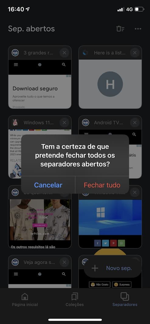 Se tiver separadores abertos, terá de os fechar a todos. Para isso carregue no símbolo do caixote de lixe que está na parte inferior. A seguir carregue em fechar tudo.