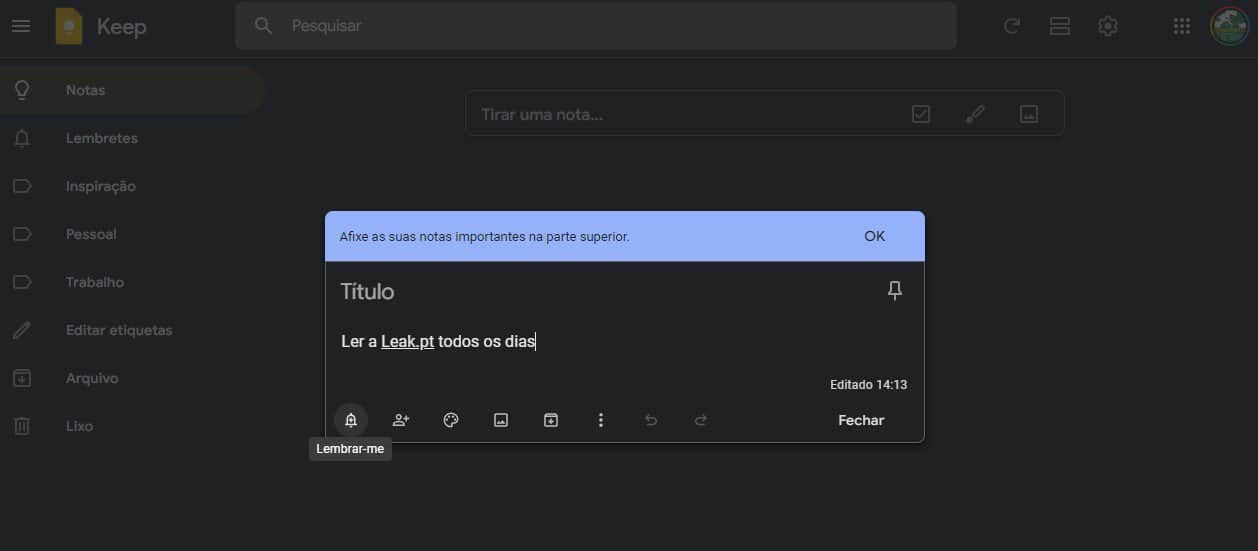 Não só pode tomar notas no Google Keep, como também pode definir lembretes. Com esta funcionalidade, pode anexar lembretes às coisas importantes que escreveu. Isto funciona em colaboração com o Calendário da Google.