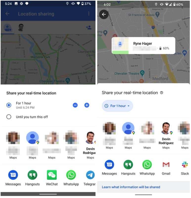 Dito isto, a Google está neste momento a enviar a atualização a todos os utilizadores, primeiramente via uma atualização da app, e posteriormente com mudanças no lado do servidor. Assim, quando a atualização chegar à sua máquina, apenas irá precisar de carregar na sua foto e ir a Partilha de Localização para aceder à funcionalidade. Veja as diferenças: