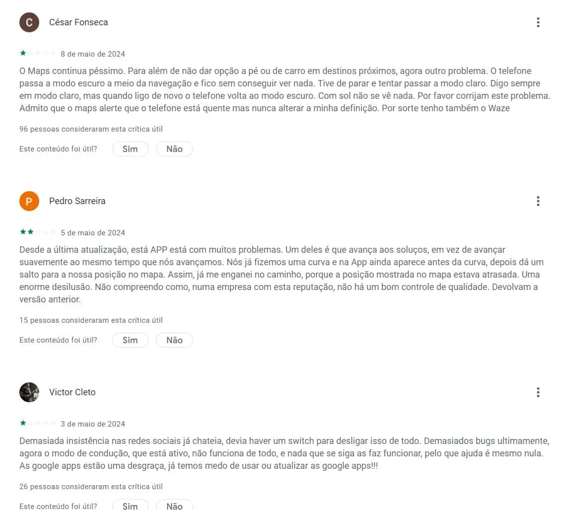No entanto, as opiniões publicadas na Play Store mostram que nem toda a gente gosta da direção que a Google adoptou para o Google Maps. Algumas pessoas ainda se queixam do tema de cores introduzido no outono de 2023, mas a maioria das mensagens assinala erros que a Google, de alguma forma, não consegue corrigir.