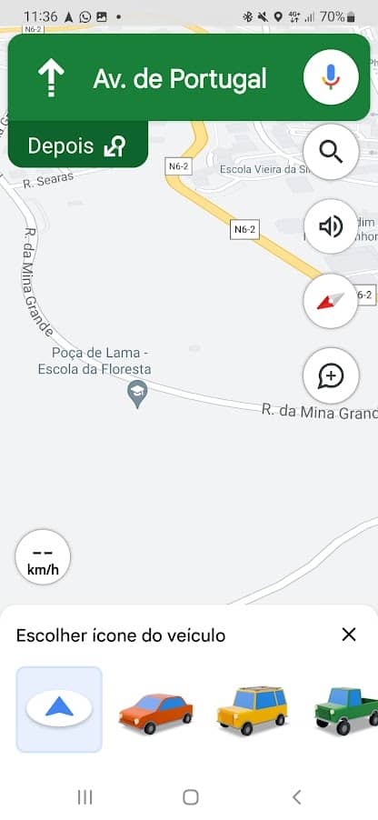 É verdade que o Google Maps vem com a seta por defeito para navegarmos. No entanto quando iniciamos a navegação para qualquer lado podemos alterá-la. Para isso basta carregarmos no círculo e surge um ecrã onde podemos escolher o ícone de navegação. Realmente é bastante simples.