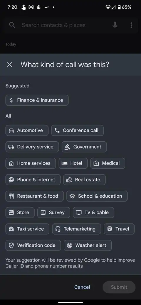 Ora no ecrã das chamadas recentes começou a aparecer um botão que nos pergunta se um determinado contacto foi feito por uma empresa. Ao carregarmos nele surge um menu pop-up na parte inferior e aí podemos dizer à Google que tipo de negócio é.