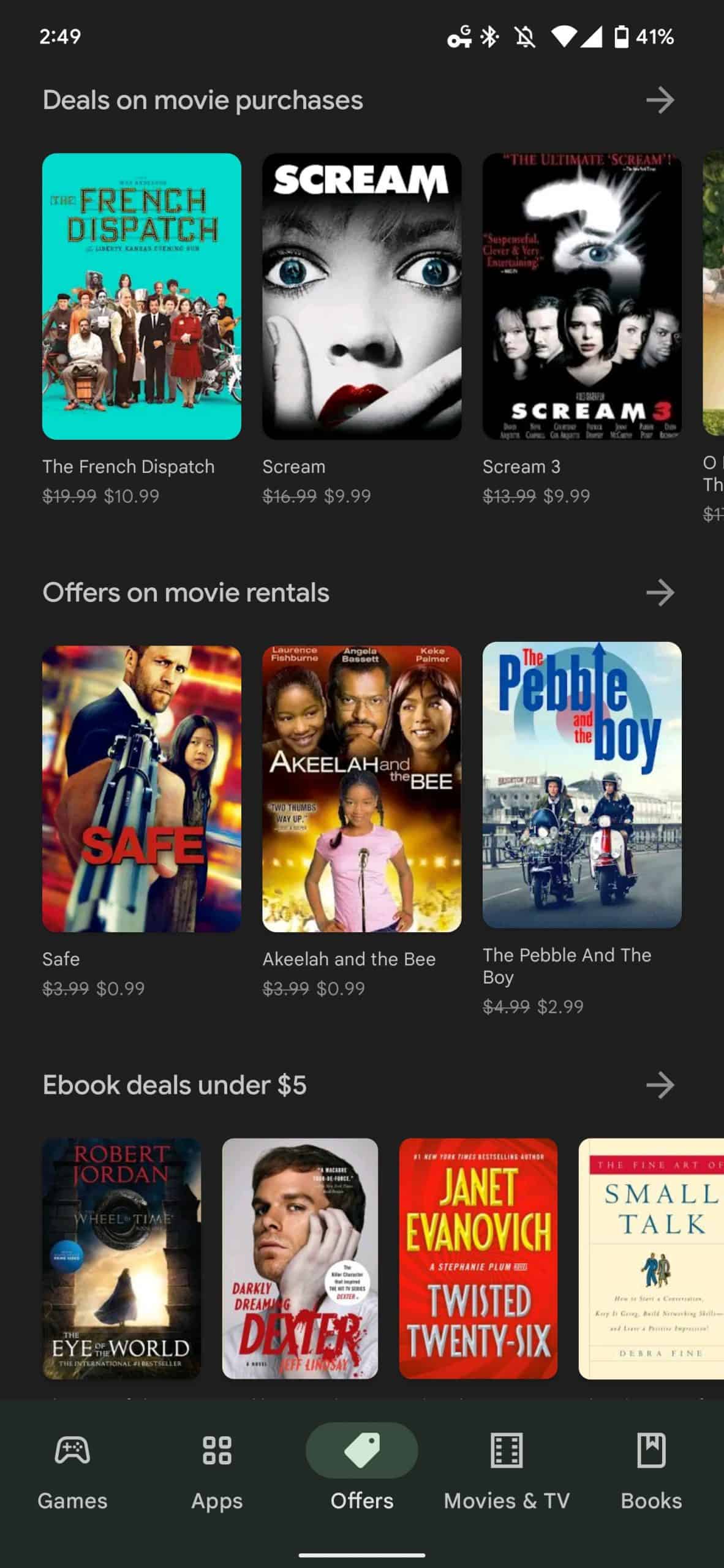 Está a ver aquela secção na app Uber Eats onde conseguimos ver rapidamente quais são as ofertas que estão ativas? É mais ou menos isso que vai estar na Play Store. Quando formos à secção ofertas vamos ficar a conhecer as maiores borlas em várias secções diferentes. Sim, porque não são apenas ao nível de jogos e aplicações. Assim, vamos poder conhecer também as ofertas no campo dos filmes e livros.