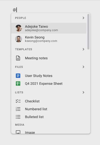 Até aqui o símbolo @ no Google Docs servia essencialmente para identificar pessoas. No entanto, agora, acaba de ficar muito mais poderoso. Dito isto, já não serve apenas para isto mas para basicamente qualquer inserção. Assim, e para além de podermos continuar a identificar pessoas, temos também acesso a um menu universal que permite inserir ficheiros, modelos e dados.