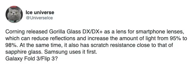 Neste momento sabe-se qual a marca que vai receber o novo vidro, mas não os modelos, embora um leakster já tenha dado uma pista. Ora a marca é a gigante coreana Samsung. O que se sabe ao certo é que será implementado em equipamentos premium. Quanto aos modelos, eventualmente será o Galaxy Fold 3 e o Flip 3.