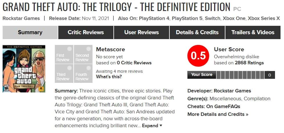 Afinal, como pode ver em cima, GTA The Trilogy tem agora uma pontuação de 0.5 num máximo de 10 pontos, o que por sua vez, faz com que seja o jogo com a pior classificação de sempre da saga. Aliás, The Trilogy fica assim abaixo de Warcraft III: Reforged, um outro remaster que foi bem recebido com uma pontuação de apenas 0.6 pontos em 10 possíveis.