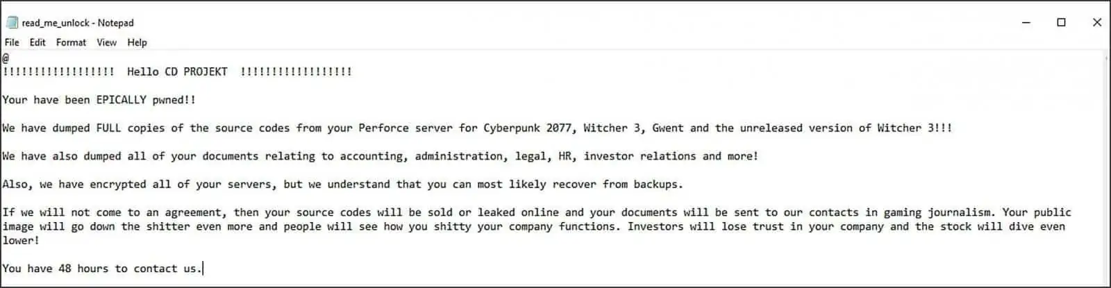A empresa revela que alguém conseguiu o acesso à rede interna. Assim recolheu vários dados relacionados com o grupo CD Projekt. Entretanto deixaram uma nota de resgate com o conteúdo que seria disponibilizado para o público. A empresa afirma que apesar de alguns dispositivos terem sido encriptados, os backups permaneceram intactos. Entretanto foram implementadas mais medidas de proteção. Para além disso o processo de restauro de dados já começou.