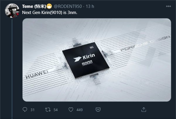 Um conhecido leakster de tecnologia largou uma bomba na Internet e que revela que algo se estĆ” a passar com a Huawei. Se fosse de um leakster desconhecido atĆ© dizĆamos que era só conversa. Agora vindo do @RODENT950 jĆ” acreditamos mais. Assim ele comeƧa por nos dizer que o próximo chip da Huawei, HiSilicon, serĆ” chamado de Kirin 9010. Isto nĆ£o Ć© uma surpresa, considerando que o Kirin 9000 jĆ” estĆ” presente no smartphone Mate 40 Pro. No entanto, de acordo com este leakster, o chip Kirin de Ćŗltima geração terĆ” 3 nm. JĆ” o Kirin 9000 Ć© baseado num processo de 5 nm.