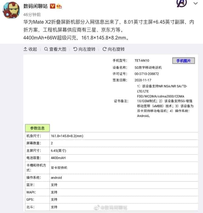 Recentemente, um smartphone com o número de modelo Huawei TET-AN10 foi certificado pelo regulador TENAA na China. A maioria das fontes ligadas à indústria acreditam que o Huawei Mate X2 é o equipamento associado a este modelo. A TENAA confirma que é um smartphone com dois ecrãs, incluindo um principal e dobrável de 8 polegadas e um ecrã externo com 6,56.
