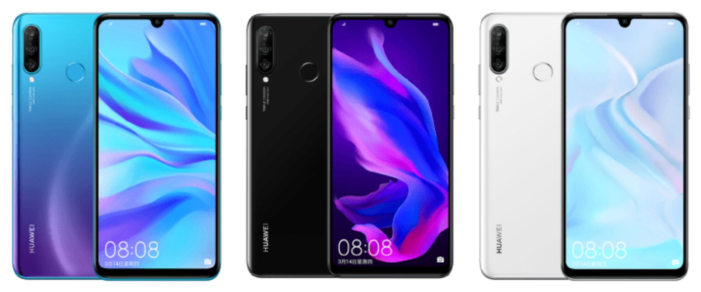 O Huawei Nova 4e com um corpo em vidro 3D e tem as dimensões de 152,9 x 72,7 x 7,4 mm. Destacam-se as variantes de cor, como branco, preto e azul.