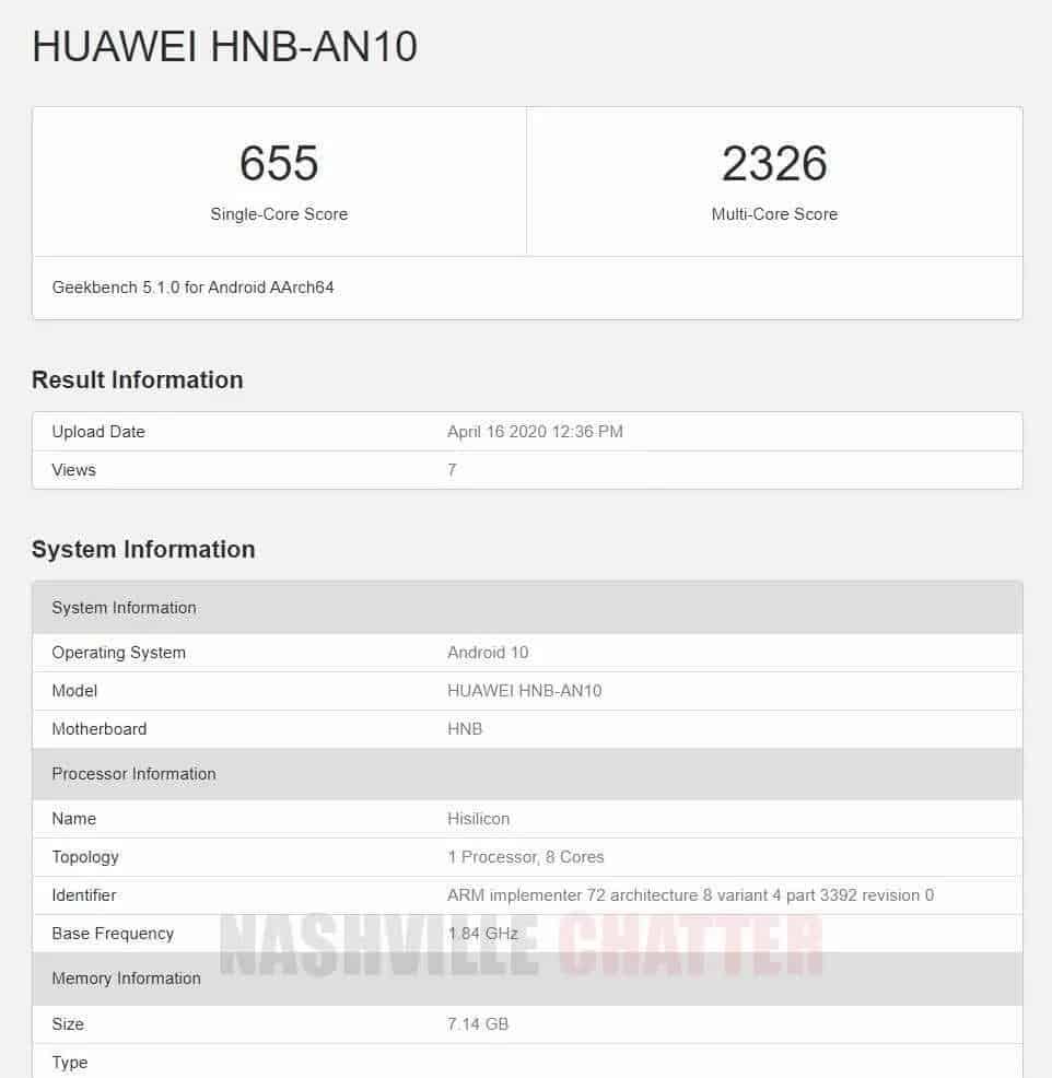 Já o modelo com o nome de código Huawei HNB-AN10 deve corresponder ao Huawei Nova 7 5G. Dito isto, registou 655 pontos no teste de núcleo único do Geekbench 5. Já no outro chegou aos 2326 pontos. O smartphone vem com o sistema operativo Android 10 e possui 8 GB de RAM.