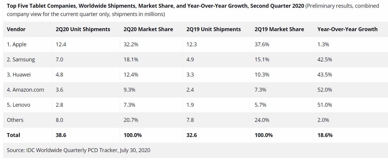 Atualmente, a Apple ainda detém a maior parte do mercado, com a Samsung, Huawei, Amazon e Lenovo logo atrás.