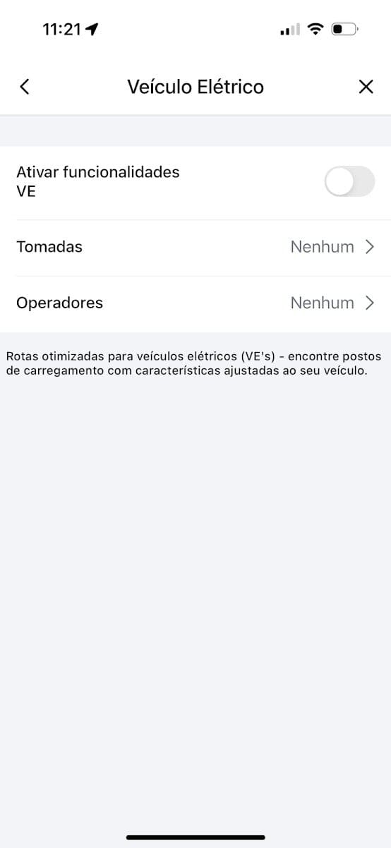 Assim se tem um veículo elétrico deve ativar as funcionalidades para este tipo de veículo. Logo a seguir indique também as tomadas e os operadores. Isto é realmente muito importante para influenciar o trajeto.