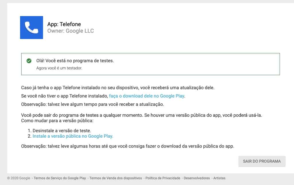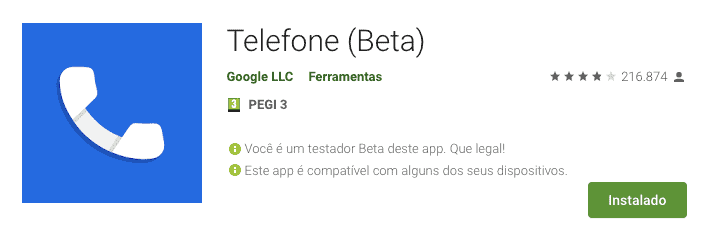 Com esse passo concluído siga o link que surge nessa página ou clique aqui para aceder à Play Store e descarregar a app Telefone. Verá que já vai surgir com a designação (beta) à frente do nome.