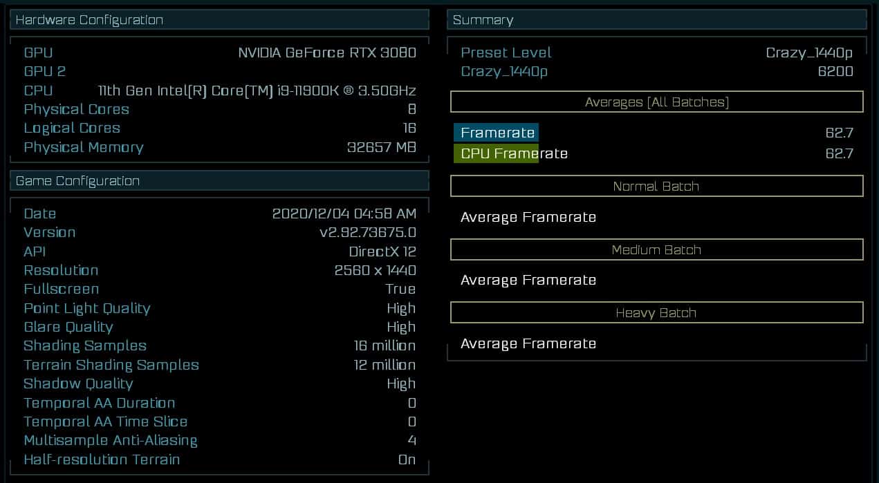 Aqui podemos ver o processador de 8 núcleos e 16 threads a 3.5GHz. Lado a lado com uma NVIDIA GeForce RTX 3080 e ainda 32GB de memória RAM. Infelizmente, o sistema apenas conseguiu alcançar 64FPS na resolução 1080p e 62FPS na resolução 1440p.