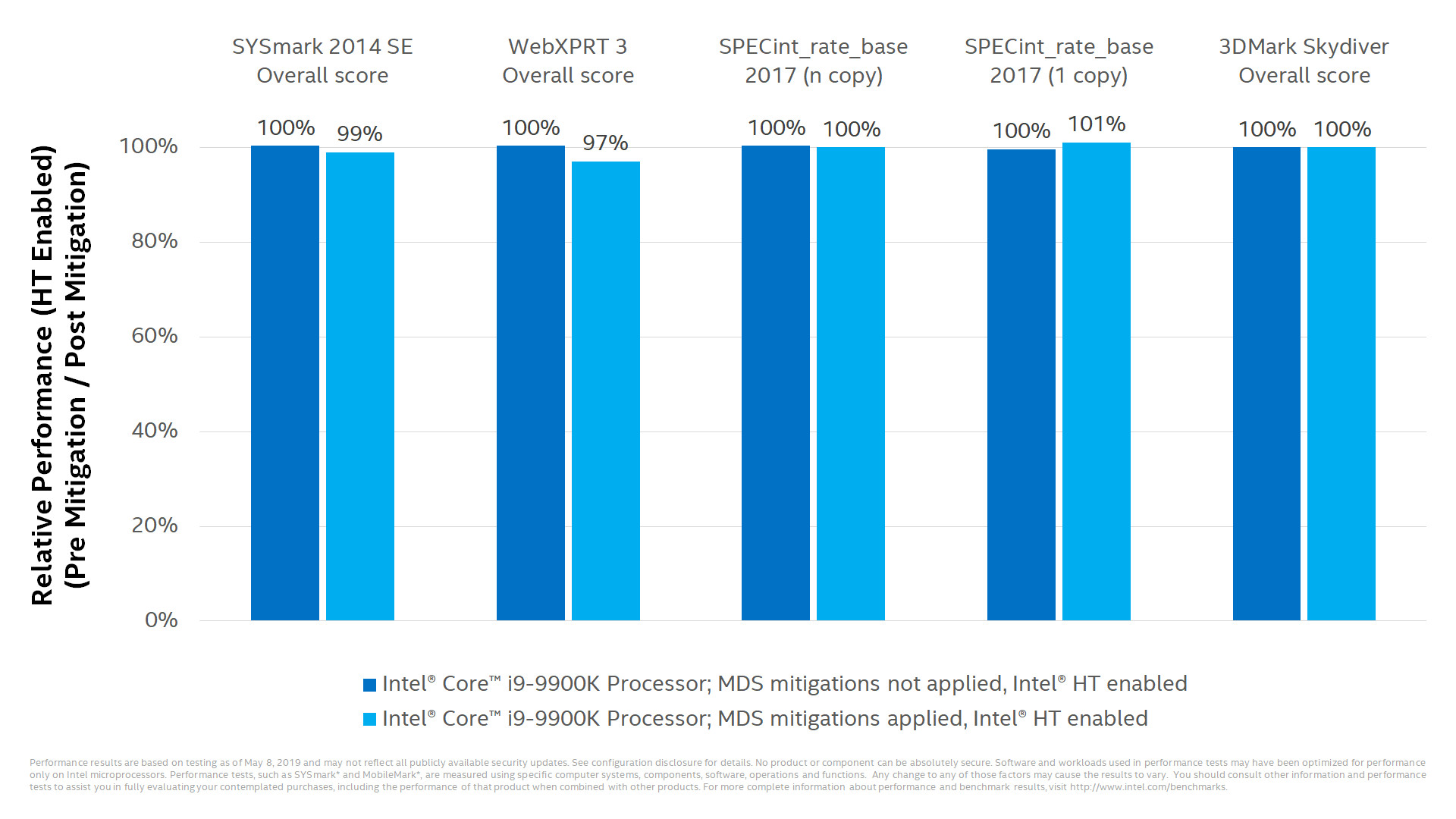 Por exemplo, uma máquina com um Intel Core i9-9900K (HTT desativado e patches de mitigação instalados), é apenas 2% mais lenta que uma máquina com um i9-9900K, com tudo ligado. Mas será que isto é bem assim?