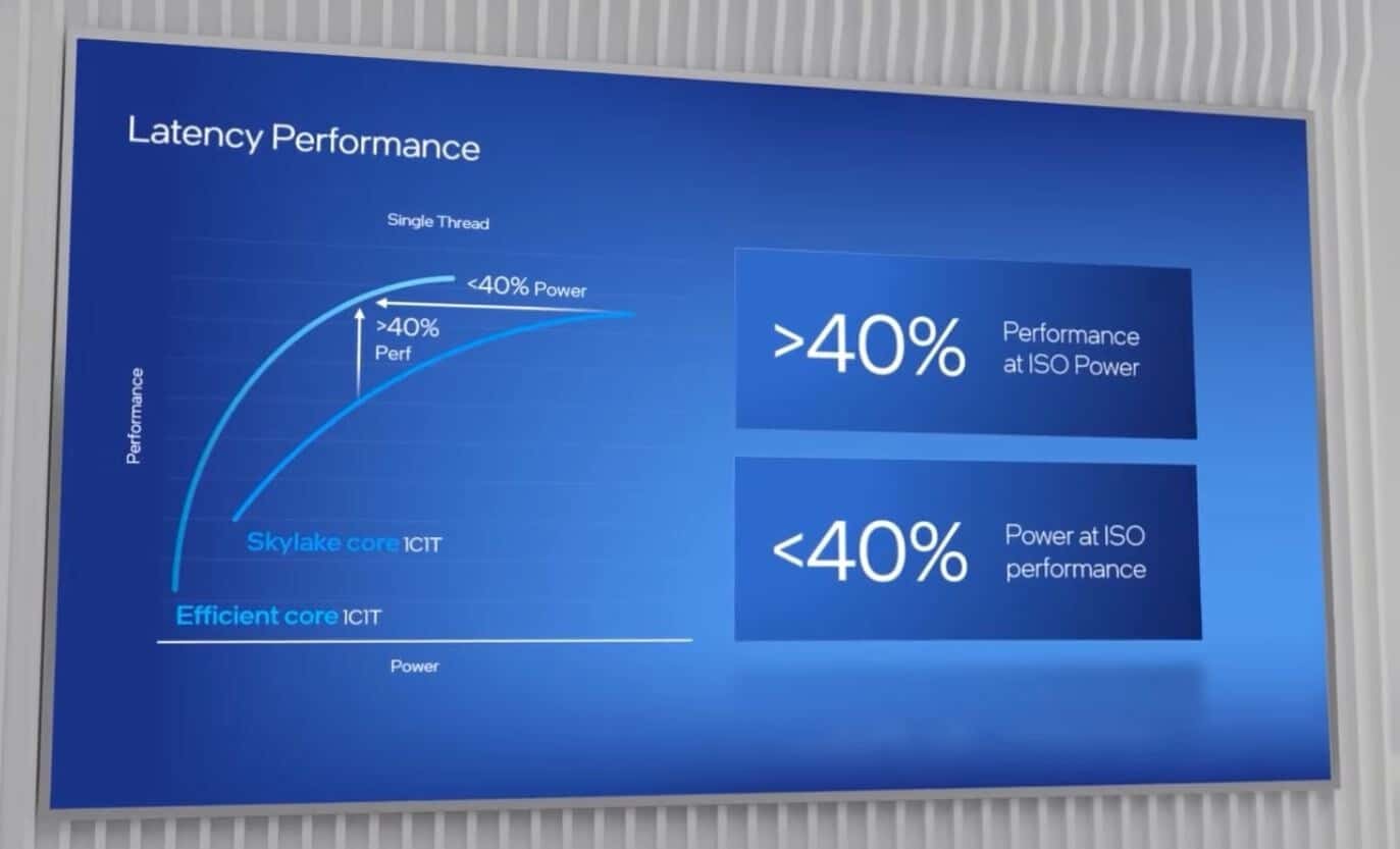 Quem o afirma é a própria Intel, que na apresentação do ‘Architeture Day’, meteu alguns números em cima da mesa para apoiar a sua teoria. É que para ter noção, os novos núcleos de alta eficiência da Intel, são perfeitamente capazes de oferecer o mesmo nível de performance que temos visto nas gerações Intel Core 8000, 9000 e 1000, a gastar menos 40% da energia.