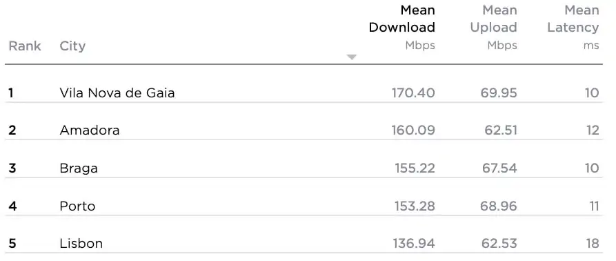 Ora neste campo a cidade onde a Internet é mais rápida é Braga. Depois temos Lisboa. A seguir o Porto, Vila nova de Gaia e Amadora.