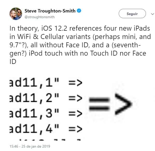 Já em outra publicação no Twitter de Troughton-Smith, o mesmo informa que nenhum dos dispositivos irão incluir Face ID. Aliás, o mesmo salienta, que os 2 modelos, ainda não conhecidos poderão ser as variantes do iPad mini e do iPad 9.7.