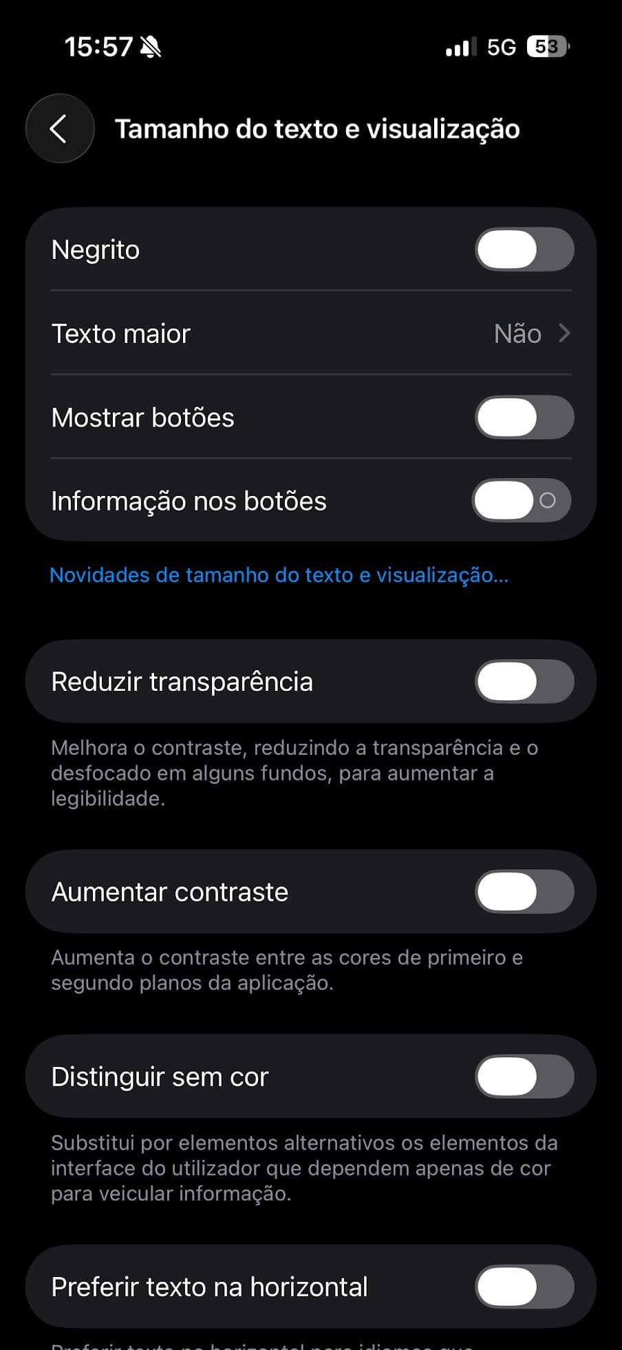Vai a Definições > Acessibilidade > Tamanho do Texto e Visualização e ativa Reduzir Transparência.