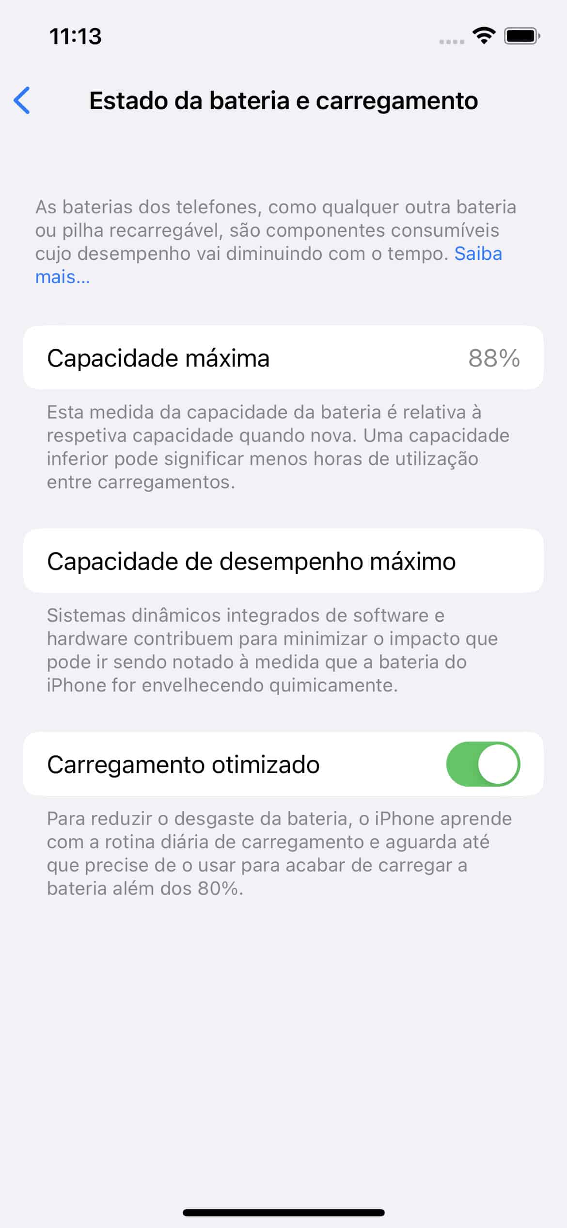 Na nova janela poderá ver a capacidade máxima da bateria. No caso deste equipamento podemos ver abaixo que é de 88%. Isto significa qual é o estado da bateria face à altura em que o comprámos. Dito isto, neste tempo de utilização já perdeu cerca de 22% da capacidade. Considerando que ele tem à volta de dois anos é perfeitamente normal.