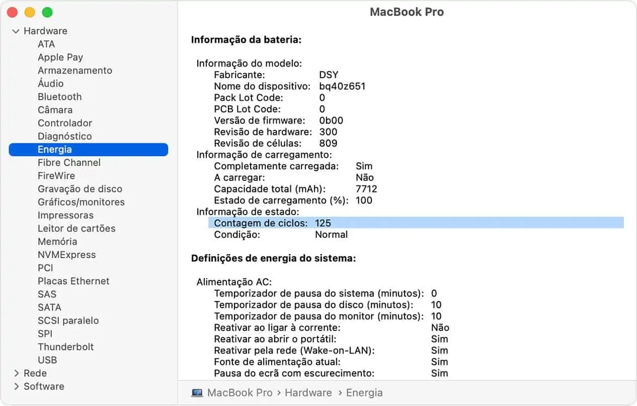 - Na secção Hardware da janela Informação do sistema, selecione Energia. Na secção Informação da bateria, encontra-se uma lista da contagem de ciclos.