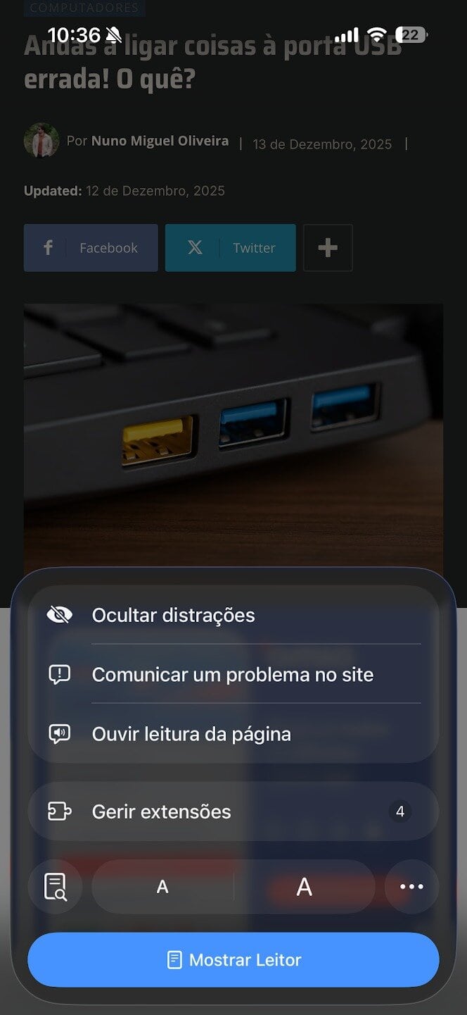 Como ativar: Toca no botão de definições da página (o ícone à esquerda na barra de endereço) e seleciona “Mostrar Leitor”. Para sair, basta repetires o processo e tocar em “Ocultar Leitor”. Também podes ficar a tocar no icone à esquerda e ele alterna automaticamente entre o modo normal e o de leitura.